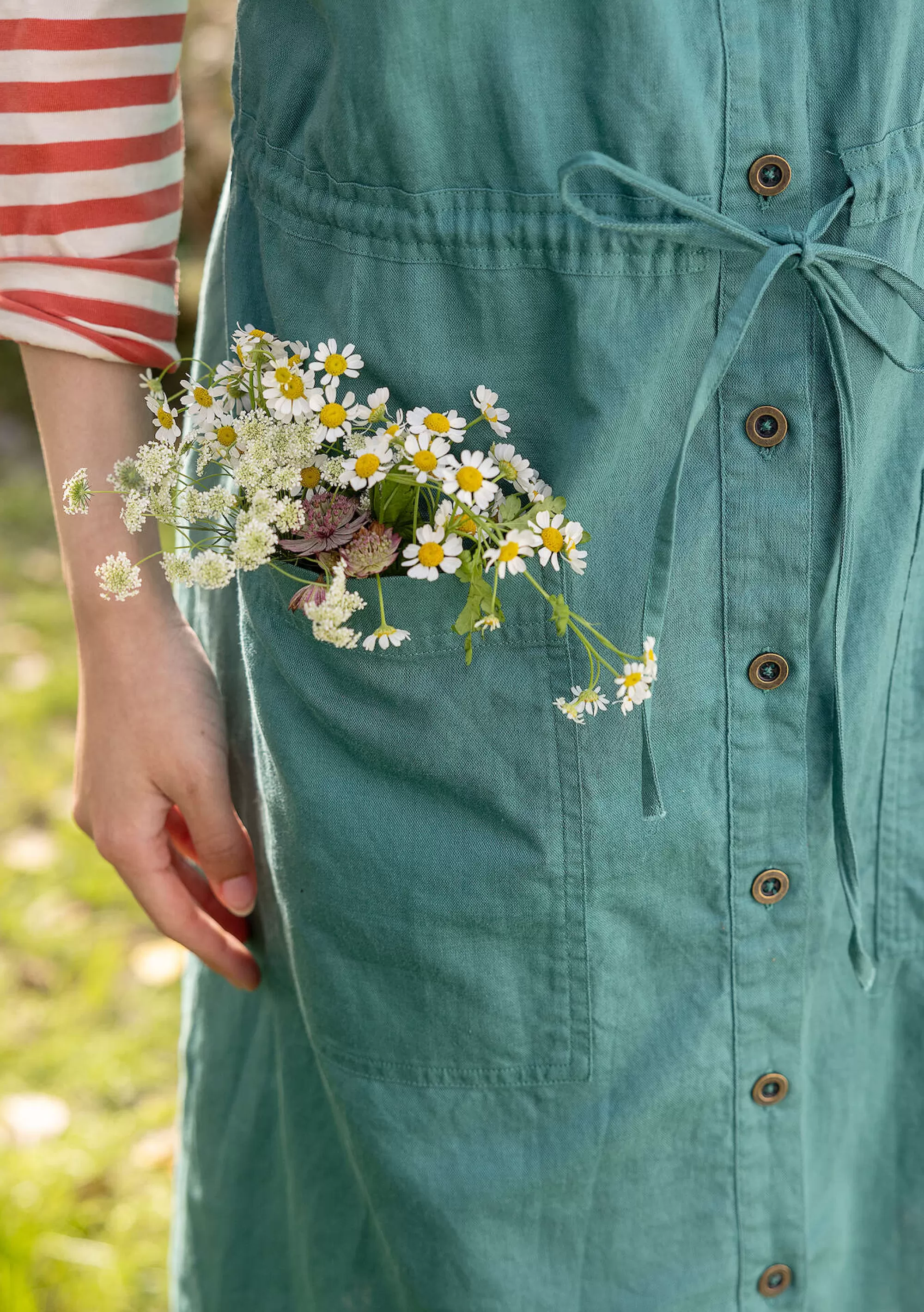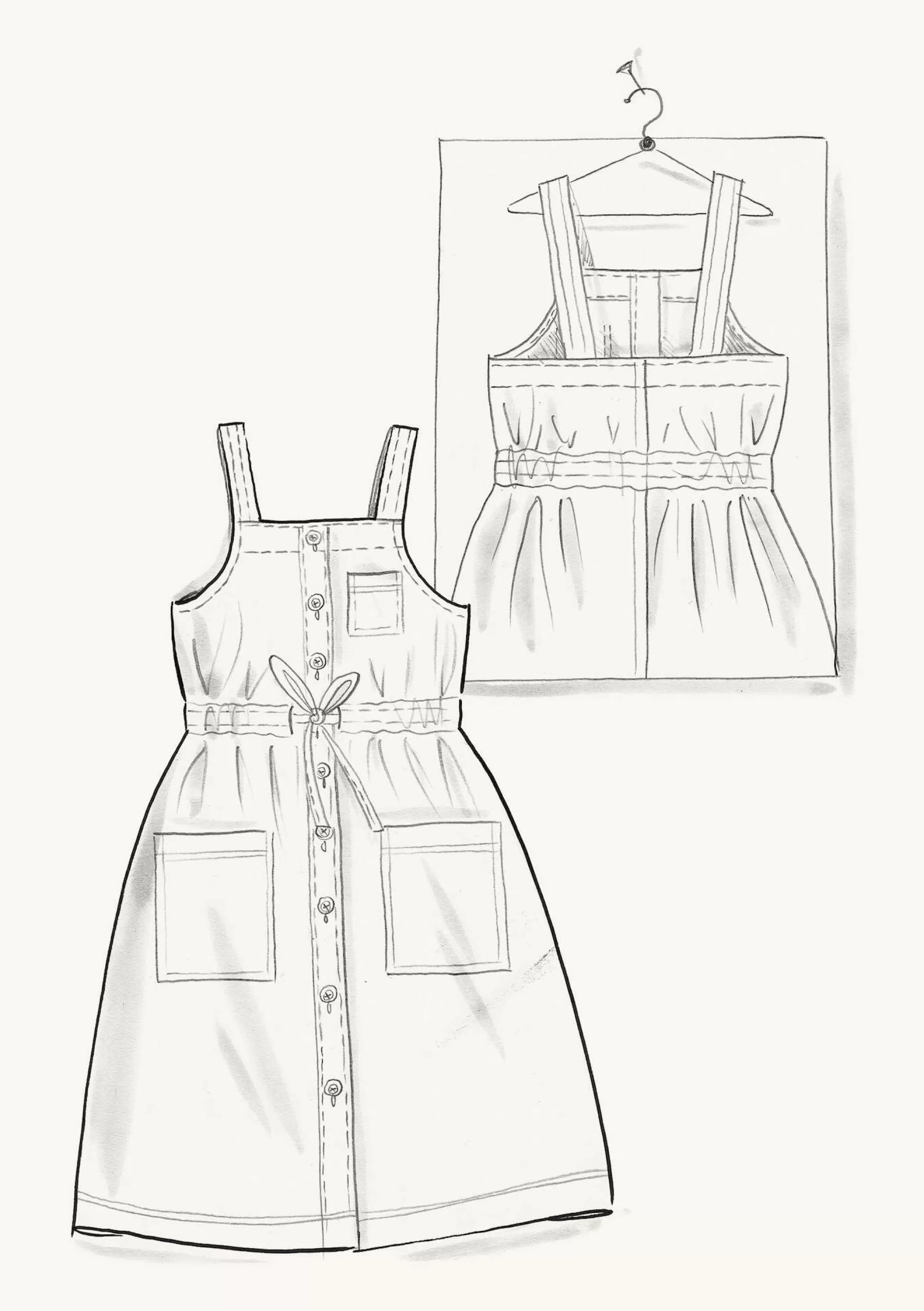 wermutkraut S,M,L,XL|Trägerkleid mit durchgehender Knopfleiste, Tunnelzug in der Taille und Metallknöpfen. Modell in leichter A-Linie, mit aufgesetzten Taschen.||